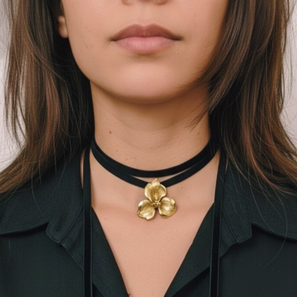 Colgante de flor elaborada artesanalmente con técnica de cera por goteo, y fundida en bronce macizo, con cordón de terciopelo negro o verde, y terminales.